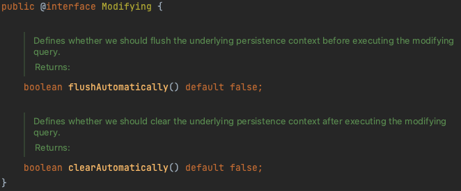 @Modifying에는 clearAutomatically, flushAutomatically 두개의 속성을 추가로 설정할 수 있다.